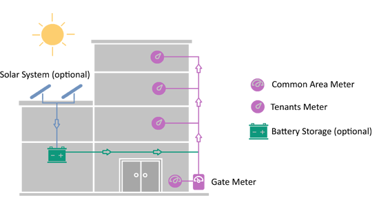 We have installed a gate meter at the incoming entry point into the site and purchase electricity for the whole building as a large market customer. We then installed private metering for every tenant and buy electricity at wholesale prices. Embedded Networks provide greater control of the sites infrastructure and, most importantly, allow us to purchase electricity at a cheaper rate than would otherwise be possible.